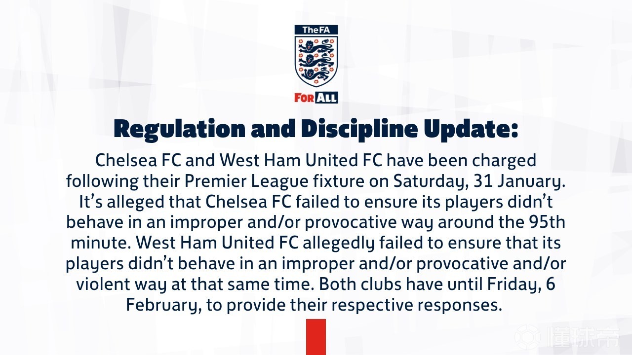 切尔西和西汉姆联因为1月31日的英超比赛被指控,据称,切尔西未能确保其球员在第95分钟时没有不当和/或挑衅行为,而西汉姆联被指控未能确保其球员在同一时间没有不当、挑衅和/或暴力行为,两家俱乐部需在2月6日之前提交各自的回应。(公告完)